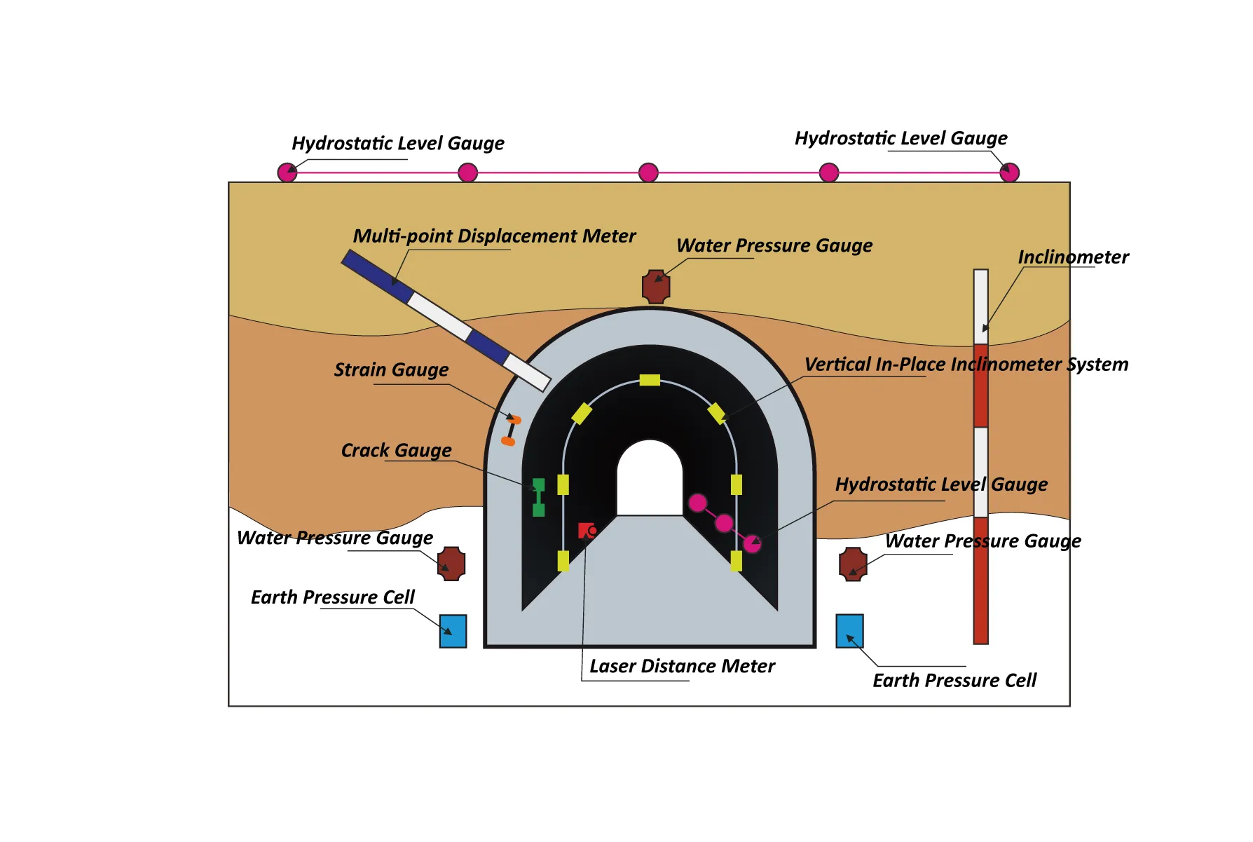 Cedimenti del tunnel, monitoraggio della convergenza, fessurazione del tunnel, monitoraggio delle deformazioni strutturali, ecc.